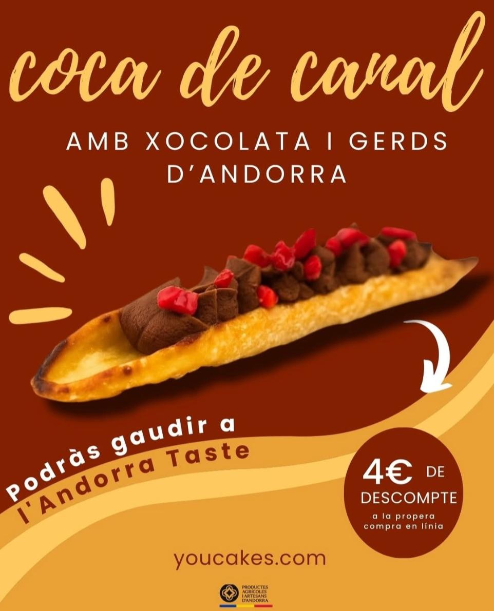🍫 La Coca de Canal amb ganache de xocolata i melmelada de gerds d’Andorra, dolç tradicional de Canillo, una massa cruixent i toc d’anís en una reinterpretació amb xocolata i gerds del país.